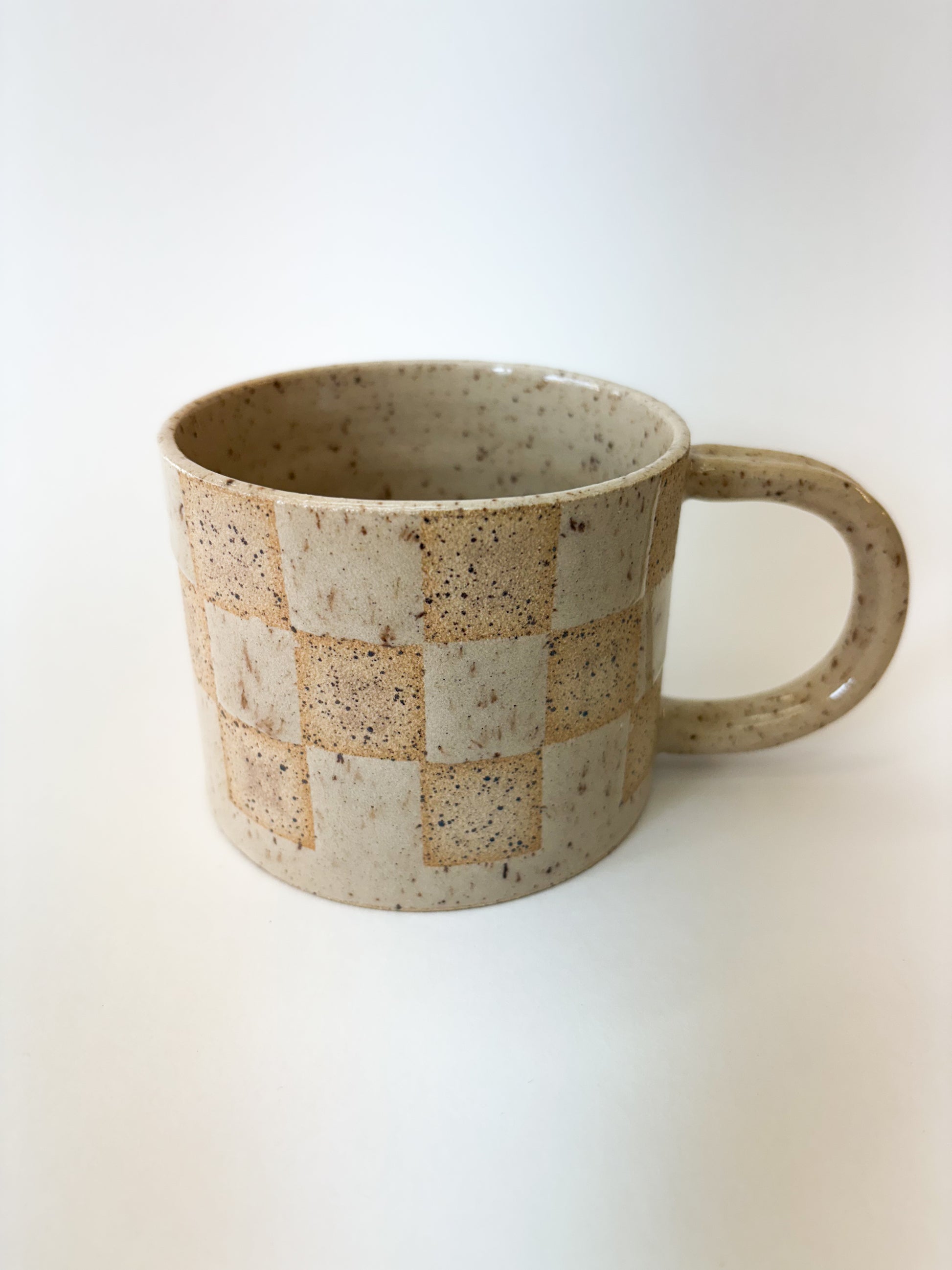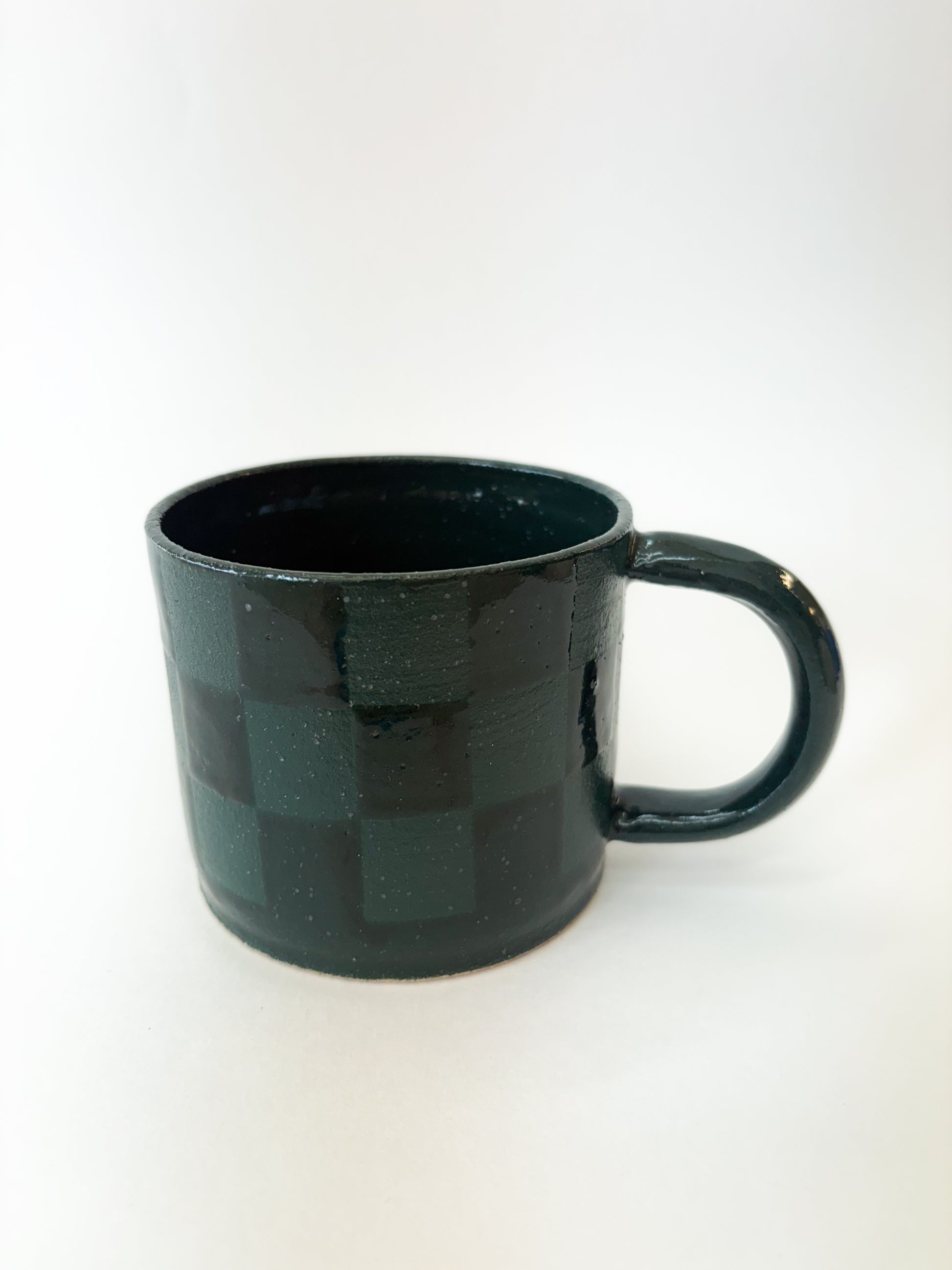 These matte/gloss checker beauties are 14oz and dishwasher and microwave safe.