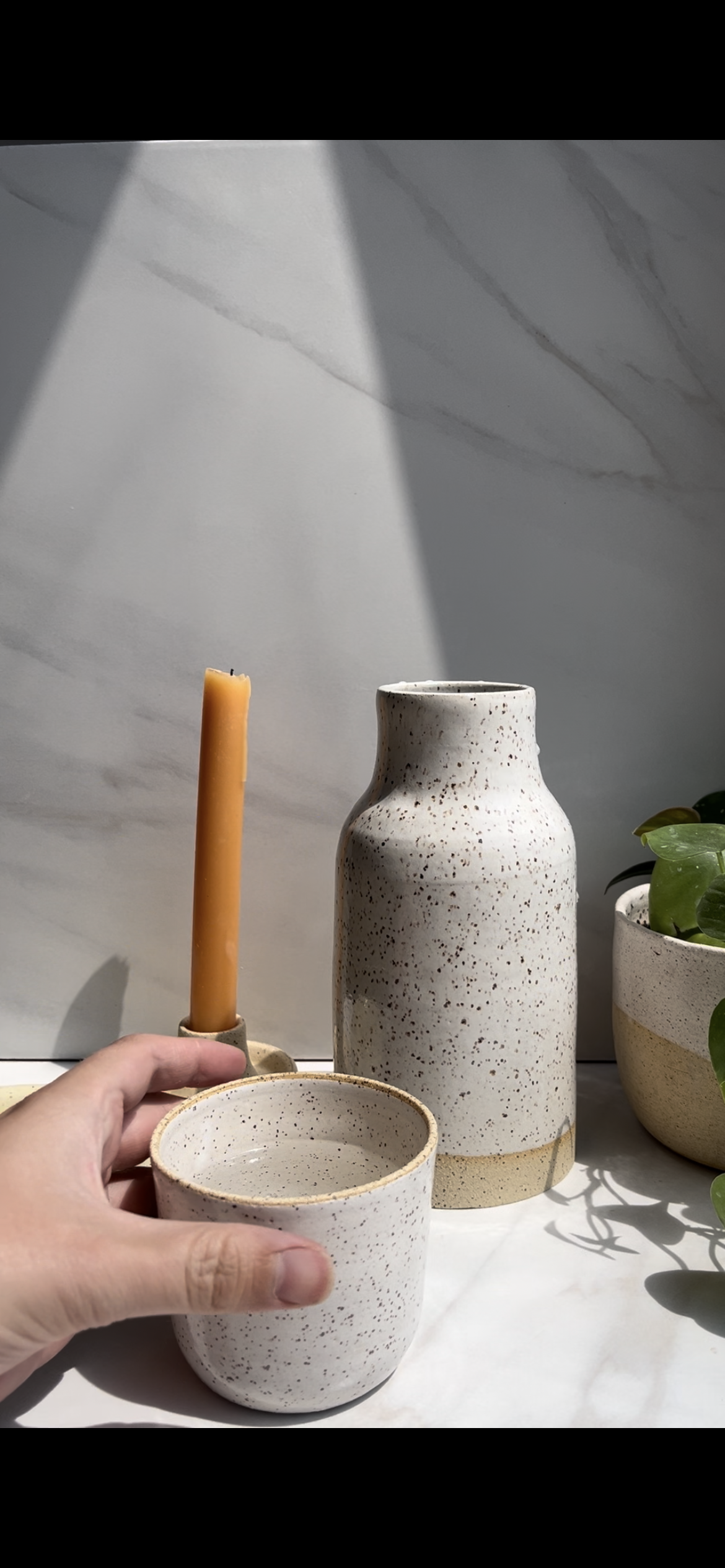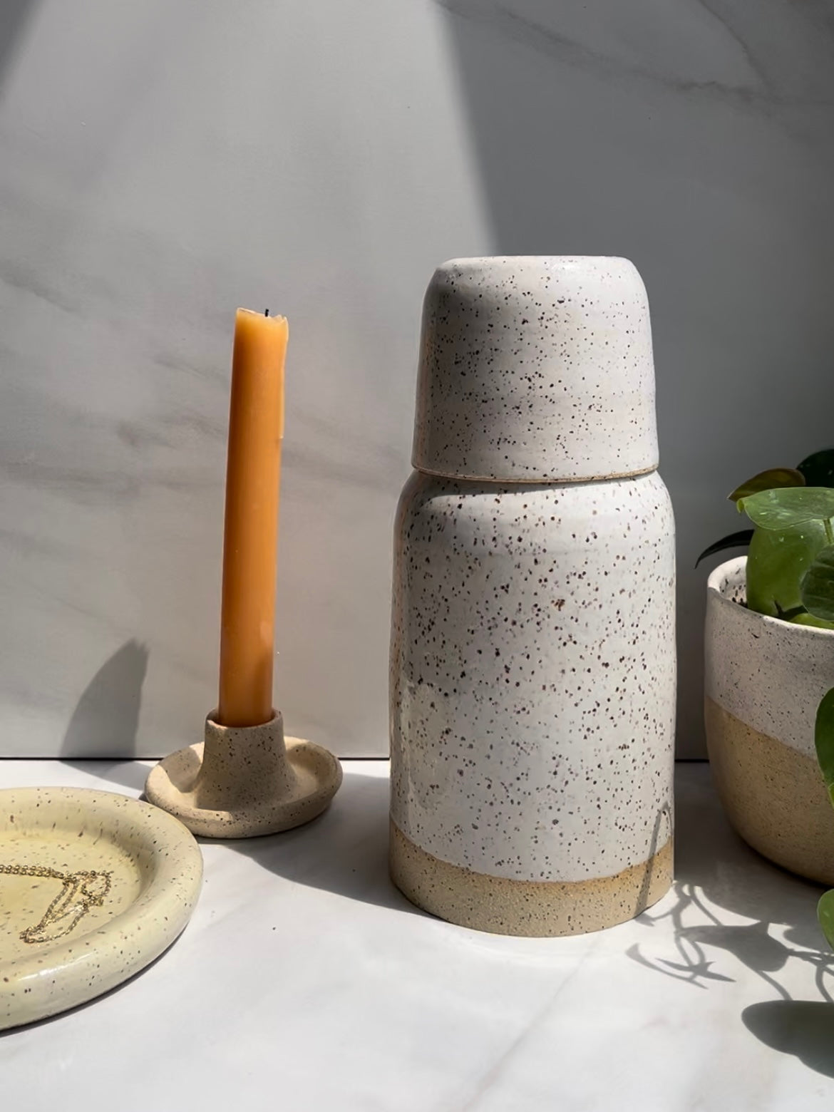 This 32oz carafe with a lid that acts as a cup is the addition your night stand has been needing. Double its function and use it during your next dinner party. Made from stoneware clay, this carafe is dishwasher and microwave safe.